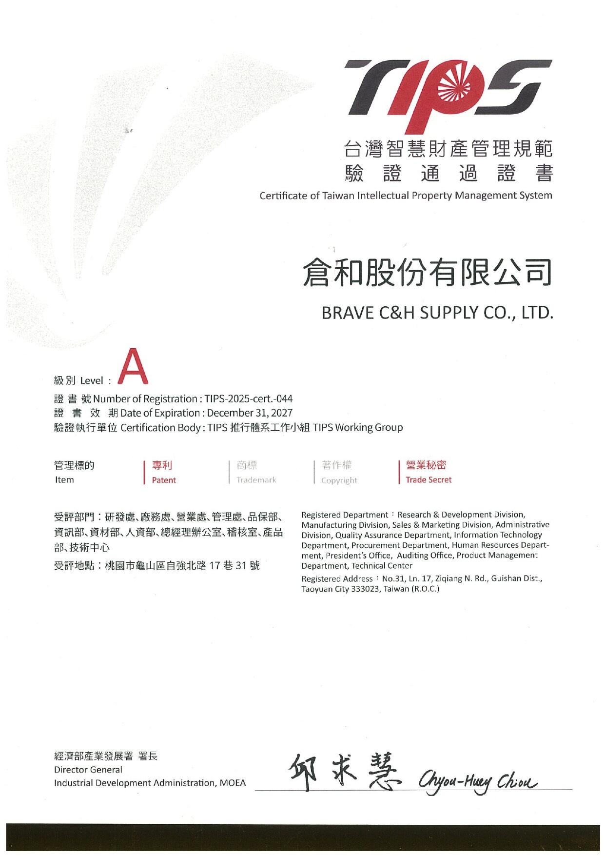 - 通過2025年TIPS(A)級再驗證(管理標的:專利與營業秘密)。 (有效日期至2027年12月31日)
